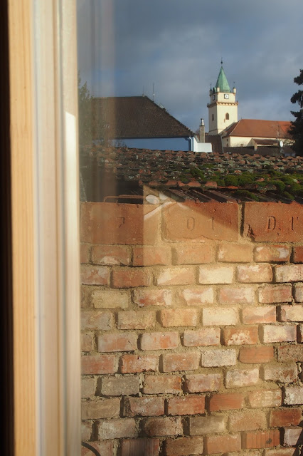 A náš jediný výhled na kostel v celém domě (bydlíme v samém centru města, ale všechna okna máme orientována na druhou stranu) a na naši nově vyzděnou zídku ze starých cihel. Francouzským oknem od psacího stolu.