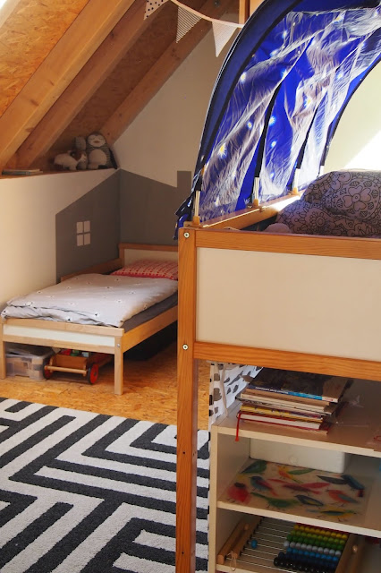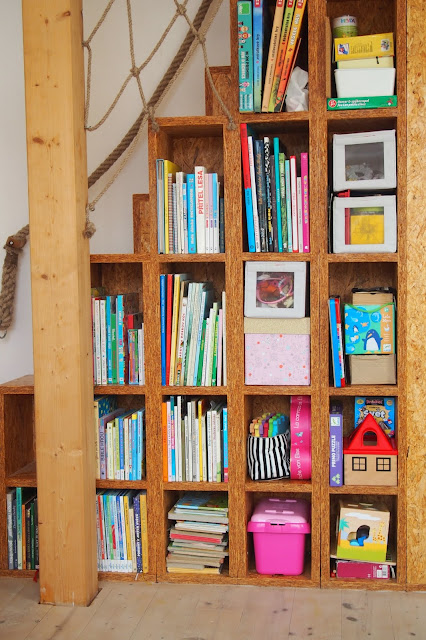 V této spodní části mají holky stůl, gauč a schody do horního, spacího patra, které jsou zároveň využity jako knihovna a úložný prostor. Celé je vymyslel, nakreslil, nechal si nařezat a sestavil můj neskutečně šikovný muž. Pokud vás zajímá, jak vypadaly schody před seskládáním a vlastně celý pokoj jako holopokoj, koukněte sem.