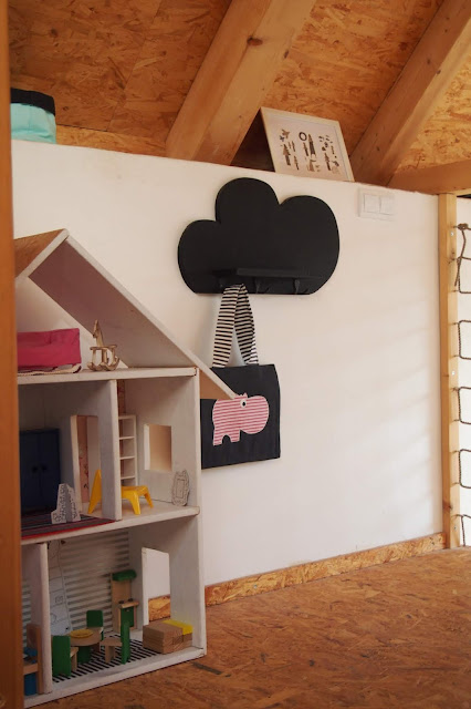 Prostor v čele Klárčiny postele zatím okupuje domeček pro panenky, časem tam nejspíše přibude úložný prostor na holek oblečení. Úložný prostor v této horní části pokoje je pro mě kapku oříšek, protože pokoj je zase jen ty tři metry široký, musí se sem vejít tři postele a z obou stran má šikminu. No uvidíme, nějak to snad vymyslíme..