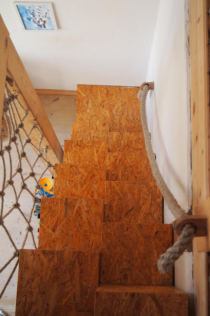 A tohle už jsou naše pokojíkové schody – postrach všech prarodičů 🙂 Kvůli už zmíněné jen třímetrové šířce pokoje, musí být schody takzvaně mlynářské a tudíž hodně prudké. Chrání je zboku mužem ručně pletená síť z lan (dokončil ji asitak pět minut před příchodem kolaudujícího úředníka) a z druhé strany zeď s lanovým zábradlím. Pro zbrždění Sáry a větší bezpečí dětí (hlavně v noci) je nad schodištěm karabinkami připevněná další síť, kterou větší děti překročí a menší podlezou. Důležité ale je, že neproběhnou..