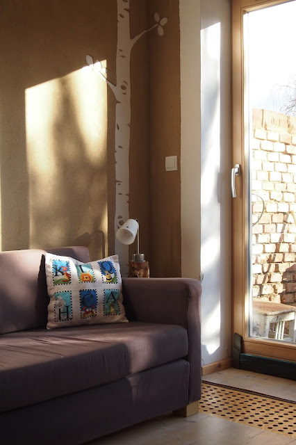 Začnu hned nejnovějším našim přírustkem - rozkládacím gaučíčkem z druhé ruky. Přibyl k nám těsně před Vánoci a Sára už asi navždy bude všem vykládat, že ho mamka s taťkou přistěhovali do pokoje společně s vánočním stromečkem ze zahrady oknem. Trávíme na něm se Sárou naše osamělá všednodenní dopoledne a úžasně z něj dvojitým francouzským oknem přehlídnete celou naši zahradu. (Ta děrovaná OSB deska je průduch z topení)