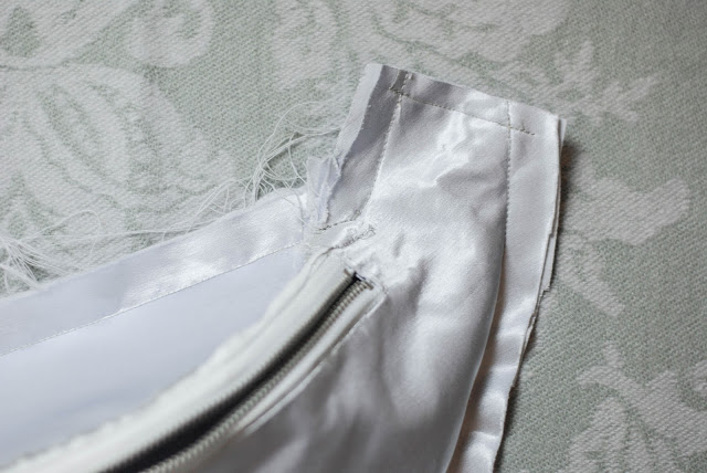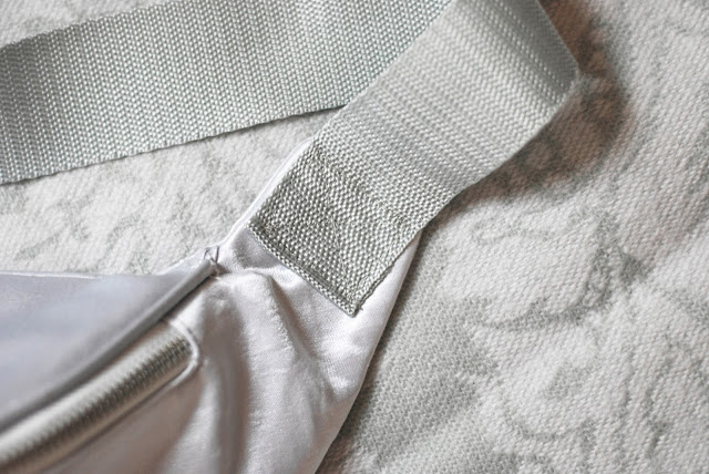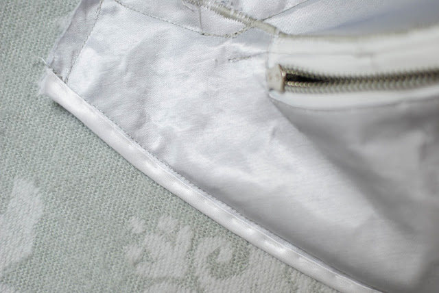 20) Aby byly vnitřní švy hezky začištěné a nepáraly se, použila jsem šikmý saténový proužek, který jsem si přistěhovala přes šev. Tím ho obalíte. Pak už stačilo v kraji prošít na stroji. Ty krátké strany nemusíte začišťovat. V tom místě se stejně bude z líce přišívat popruh.