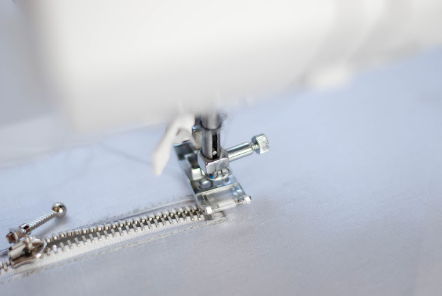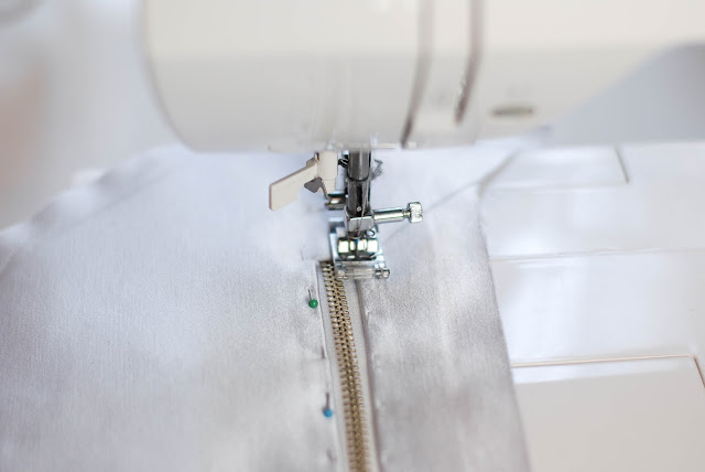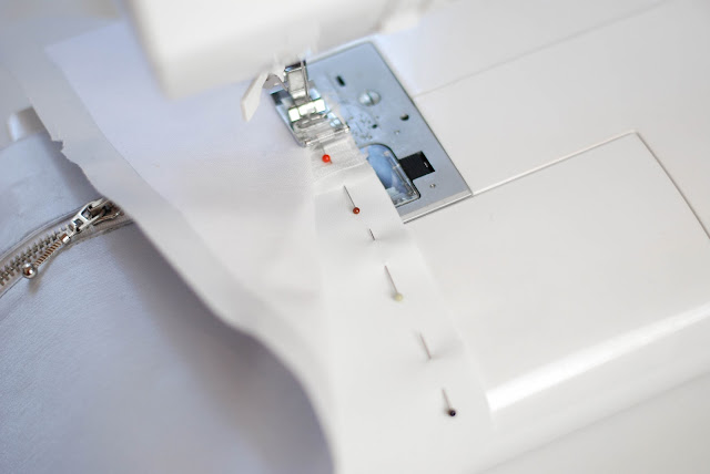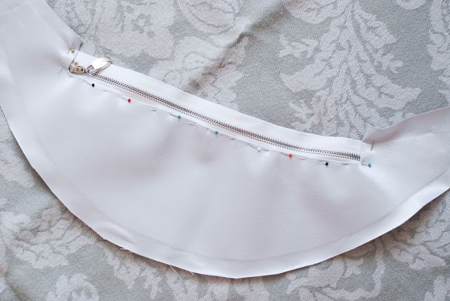 4) Z lícu si stejně jako je na fotce přišpendlete zip, ten si pak i přišijte dočasně stehovkou. Bude se vám při šití snadněji pracovat.