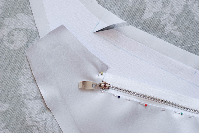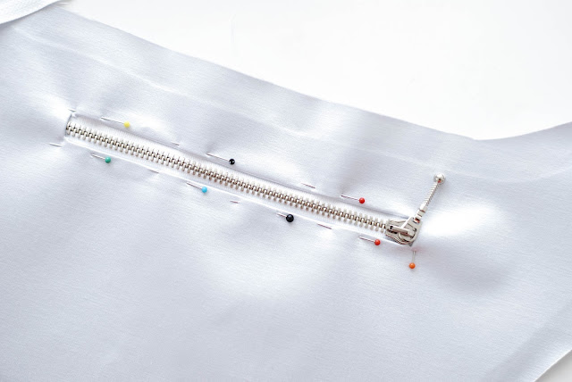 13) Přiložím z líce zip do otvoru, zašpendlím, tak jak je na fotce a přistehuju.
