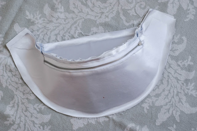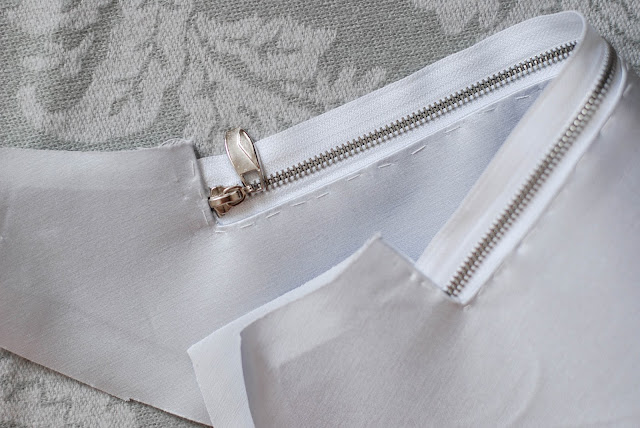 9) V tomhle bodě zašíváte růžky otvoru kapsy společně s podšívku. Tzn. obě vrstvy podšívky jsou na sobě. Sešíváte vrchní látku, pod ní konec zipu a oba díly podšívky.