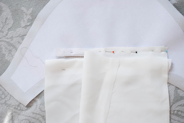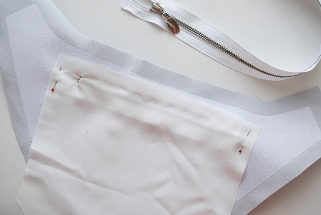 5) Než přijde na řadu všívání zipu, je potřeba přidat podšívku kapsy. Ta je ze dvou obdélníků. Horní strany jsou o něco delší než je šířka otvoru na kapsu. Přiložte první díl podšívky k vyšší linii kapsy. ta co je více nahoře a nastehujte přesně v místě, kde budete z lícu zip prošívat na stroji. Ty krátké strany zatím nechte být.