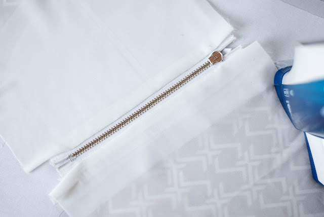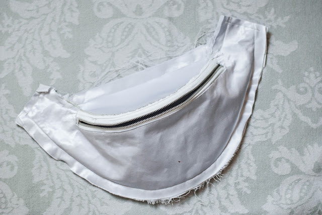 12) Teď přijde na řadu dlouhý zip. Je potřeba ho všít do předního dílu ledvinky. To je je ta nejširší část. Je to podobné trochu jako s malou kapsou. Zastřihnu si otvor na zip do růžků. Žehličkou si sežehlím záševky do rubu.