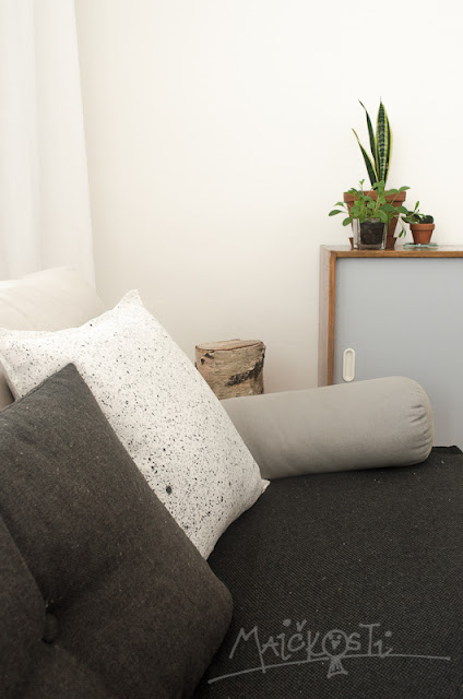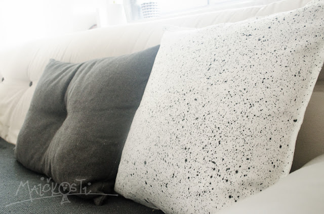 Na výrobu jsem použila již hotový povlak z Ikea, neb na ruční výrobu povlaku se všitým zipem jsem se fakt necítila. Postup je celkem jednoduchý, použila jsem černou barvu na textil, kterou jsem trochu zředila vodou a poté stříkala štětcem přes prst. Navzdory jednoduchému postupu ovšem člověk musí mít trochu cit v ruce, protože není flek jako flek. Chvíli mi trvalo, než jsem vyladila, jak moc barvu ředit a jak stříkat. Pokud byste se chtěli o něco podobného pokusit, pak vězte, že příliš řídká barva se na látce bude rozpíjet. Příliš hustá zas bude málo vystřikovat a po chvilce se nahromadí v pěnové konzistenci ve štětci a pak spadne dolů v podobě velké nehezké kaňky. Takže prostě namíchejte tak akorát a pak prstem lechtejte štětinky rychlými krátkými pohyby. Doporučuju spíše ploché štětce, široké, s kratšími a tvrdšími chlupy – to se osvědčilo mně. A mějte po ruce vzorek látky, na které si to osaháte, než se do toho pustíte na ostro. Já měla polštářky tři, zkoušela a zkoušela. Dva jsem si nechala a ten nejpovedenější poslala do Irska. Z každé strany jsou stříkance trochu jiné, z jedné větší a z druhé jemnější, takže se dá povlak otočit dle libosti :-)…