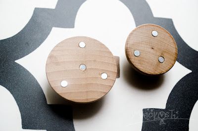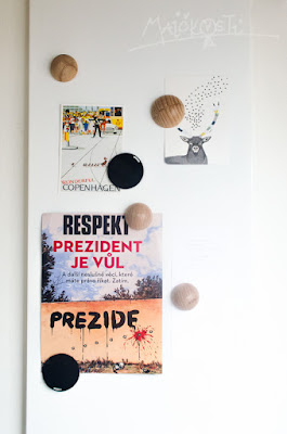Hned nato přibyly na tabuli i doma vyrobené dřevěné magnetky. Ty vznikly tak trochu spontánně. Švagrová totiž měla na půdě krabici plnou dřevěných komponentů k sestavení hraček: různé kroužky, tyčky, kolečka, ale i hlavy, uši… no a tyhle dřevěné polokoule. Nebyl v nich žádný otvor ani drážka a marně jsem přemýšlela, k čemu by Madle mohly být. Co mě však napadlo téměř okamžitě, bylo, nač bych je použila já… a tak jsem je dceři prachsprostě zabavila. Manžel mi pak do nich v práci vyvrtal dírky, vsadil malé magnetky a hurá – praktická dekorace je na světě.
