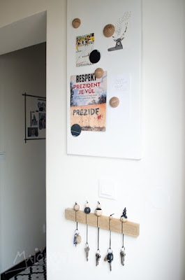 Stále pokračuju v zabydlování naší předsíně. Jedním trnem v oku mi dlouho byla (a určitě nebudu jediná) dvířka k elektrojističům. Prostě takové plechové dveře strašící na frekventovaném místě, hodně na očích. A teď co s nimi. Zvažovala jsem je překrýt dřevěným panelem, ale jelikož už v tomto kousku bytu začíná být předřevováno (uvidíte v některém z následujících příspěvků), rozhodla jsem se nakonec pro méně nápadnou bílou magnetickou tabuli. Když jsem zjistila, že ta z Ikea má asi o 2cm větší šířku než zmiňovaná dvířka a výšku ideálně tak, že se pod ni ještě vleze věšák na klíče (který už znáte z TOHOTO příspěvku), nebylo nad čím váhat!