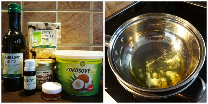 13 g kokosový olej, 13 g bambucké maslo, 6 g včelý vosk (pre vegánov náhrada kandelilský ), 1 lyžica mandľového oleja, kvapka medu, pár kvapiek prírodnej medovej vône a pár kvapiek vitamínu E, ktorý pôsobí ako konzervant. Ešte budete potrebovať vysúvacie tyčinky alebo malé dózičky. Všetko sa dá zohnať v špecializovaných internetových predajniach.