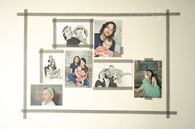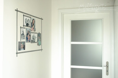 Dlouho jsem chtěla na stěně v naší předsíni vytvořit koláž z rodinných fotek, ale nemohla jsem se rozhodnout, jak to pojmout. Ani hodiny strávené čerpáním inspirace na internetu nepomohly, nic mě neoslovilo. A než tam natlouct hmoždinky a zjistit, že to vlastně není to pravé, rozhodla jsem se pro dočasné řešení: jednoduchá nástěnka/fotogalerie, která nezanechá na stěně žádné stopy. Použila jsem několik nejoblíbenějších fotek z našeho posledního rodinného focení v ateliéru, ‚žvýkačku‘ určenou na stěnu a černobíle pruhovanou washi pásku. Nejprve jsem si na zemi sestavila fotky do požadovaného tvaru a pak – zcela od oka – je žvýkačkou připevnila. Pak jsem některé fotky pojistila ještě washi páskou, ale to už spíš kvůli efektu, a nakonec ozdobila rámečkem. Ten jsem lepila opět intuitivně, nic jsem nevyměřovala, pouze jsem vždy po nalepení každé strany poodstoupila a mrkla, jestli dobrý. Washi páska je v tomto ohledu vděčný materiál – kdyby to dobrý nebylo, jednoduše sloupnu a upravím. Mně se to nějakým zázrakem podařilo na první dobrou, takže celkový strávený čas byl asi tak 15-20 minut (čili tvoření pro zaneprázdněné matky!). Zkusila jsem dvě varianty, obě nafotila a vlastně si doteď nejsem jistá, která se mi líbí víc. Co vám?