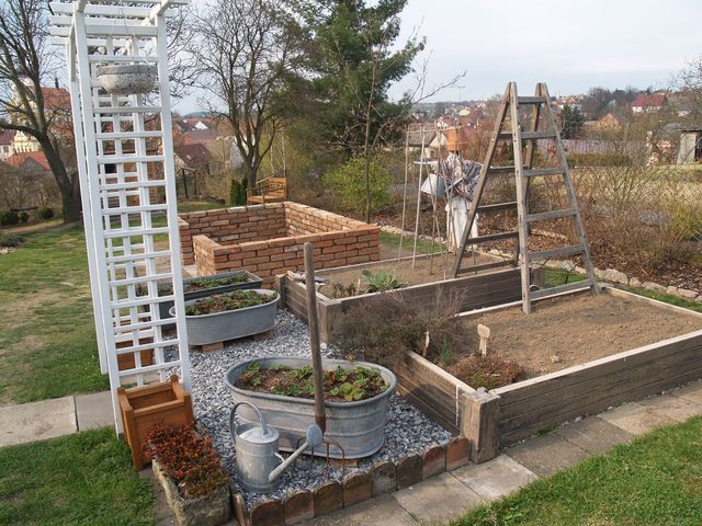 úprava terénu, recyklace cihel, starých dlaždic, víka od kanálu, zbytek štěrku ze dvora, vykopání schodu do skleníku, aby se člověk nemusel plazit po zemi. Nu a já už tam dala tu lavičku, kterou jsem tam viděla, ještě než celá realizace začala, dnes už jsme na ní seděli, nádhera a ten klid....