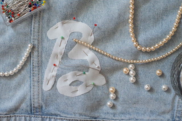 Pokud si budete chtít nápis ozdobit korálky jako já, přišijte po obvodu písmen jemné malé perličky. S mezerami mezi sebou to bude vypadat něžně. Pokud máte úplně drobné korálky, tak můžete písmena obšít kolem dokola. Nebo je vyplnit flitry, tady je tolik možností, jak si s tím vyhrát.