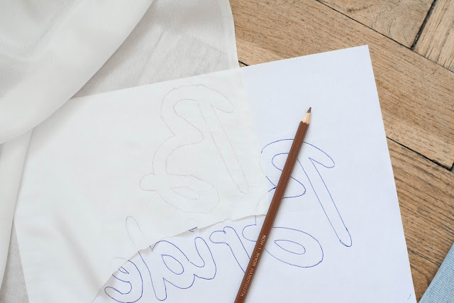 Tenhle krok dělám kvůli tomu, že na nápis jsem použila bílou tenkou látku, která prosvítá a můžu si obrácený nápis předkreslit pastelkou na látku. Proč to dělám z obráceného fontu? protože tužku tak předkreslím z rubové strany látky a když písmenko vystřihnu a obrátím, tak ho z lícu nemám počmárané, ale hezky čisté. Co dělat, když nemáte průsvitnou látku? Nápis není potřeba obkreslovat z druhé strany papíru. Stačí písmena vystřihnout, přiložit na látku, obkreslit a pak vystřihnout z látky.