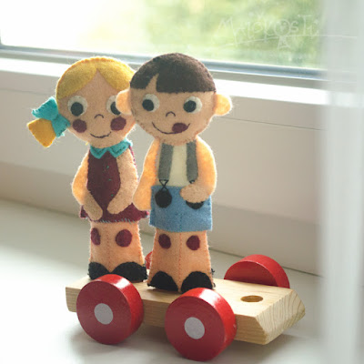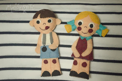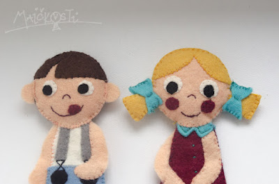 Trvalo to dlouho, ale do naší (zatím skromné) sbírky přibyli dva noví prstoví maňásci – kluk a holka. Oproti výrobě zvířátek, o kterých jsem psala TADY, musím přiznat, že tohle byla piplačka už i na mě. Barevné oblečky z několika částí, ruce, nohy, detaily… pořád bylo potřeba měnit nitě, přemýšlet, jak kterou část k sobě spojit… výsledek není zdaleka stoprocentní, jak bych chtěla, a ke konci už síly docházely, a tak si myslím, že příště budu hledat ispiraci opět ve zvířecí říši a na nějaké princezny si nechám alespoň dočasně zajít chuť. Nicméně radost ti dva pidižvíci, zdá se, udělali. Madla je zpozorovala v procesu tvorby a hned se po nich začala natahovat, paní ještě v tu chvíli neměla přišité nohy, ale vůbec to nevadilo, dcera hned pochopila, na kterou její končetinu je to určené a velikostně to bylo tak akorát, takže jsem skoro zapochybovala, zda ji vůbec dokončovat. Nakonec jsem to ale udělala, aby se na ni pán moc nepovyšoval, takže teď je z nich docela milý páreček.