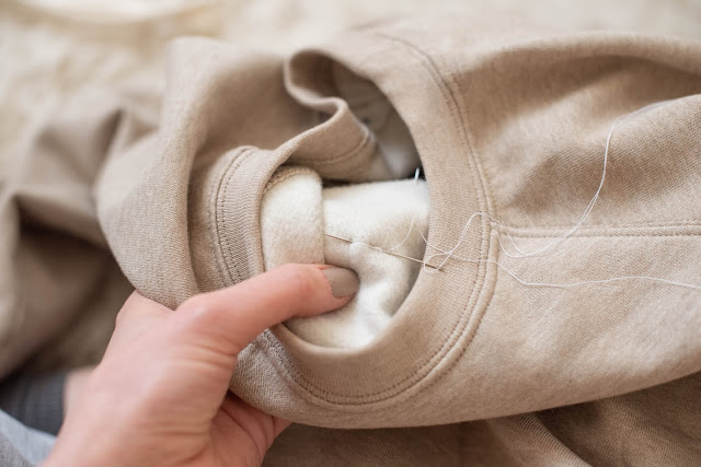 Nejsnazší způsob mi přišlo přišívat lanko z rubu pomocí zadního stehu nebo jen cik cak stehem po obvodu lana tak, aby z líce nebyla nit vůbec vidět. Důležité je, aby to zepředu vypadalo čistě, ale lano zároveň neodstávalo. Ještě je možnost šít lanko středem z líce, tedy uprostřed šířky po celé délce, pokud umíte hezký pravidelný steh a máte stejně barevnou nit. Jak uchytit konce lana? Jednoduše pomocí několik stehů jak z rubu, tak z líce. Cílem je, aby se vám vazba lana dál nepárala a vydržela i nějaké praní. Ale zároveň, aby to zapošití bylo nenápadné a vypadalo to jako, že je lano na mikiny přilepené.