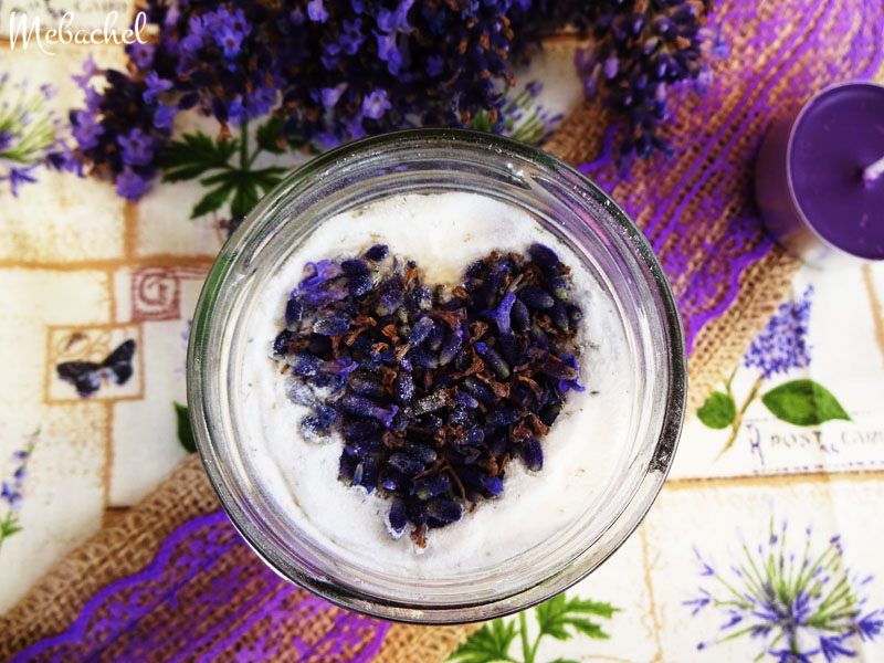 Do sklenenej fľaštičky som postupne vrstvila epsomskú soľ a čerstvé kvietky levandule. (O účinkoch epsomskej soli som písala tu ). Po mesiaci môžme používať do kúpeľa. Do vtedy poslúži ako pekná dekorácia na poličke v kúpeľni.
