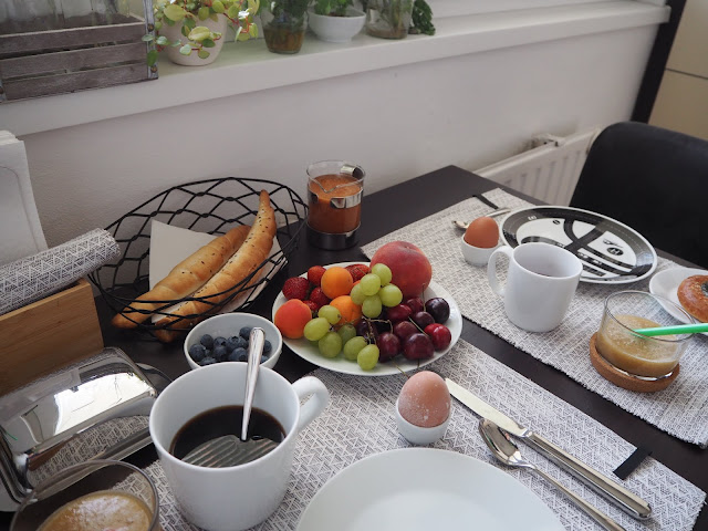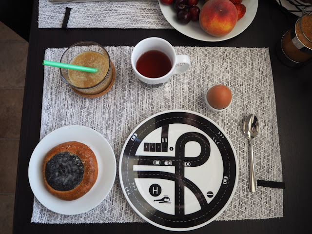 asi před měsícem Bertík projevil přání, že by zase chtěl hotelovou snídani. Nemůže totiž zapomenout, jak jsme vloni ztroskotali v Brně. Teda hlavně na tu hotelovou snídani a PÁREČKY, které tam spořádal. Dostat se do hotelu u nás hrozí jedině ve stejném případě jako vloni, tak jsme si pár podobných snídaní udělali doma. Taková ta klasika s vajíčkem a kupovaným koláčem 😉 …