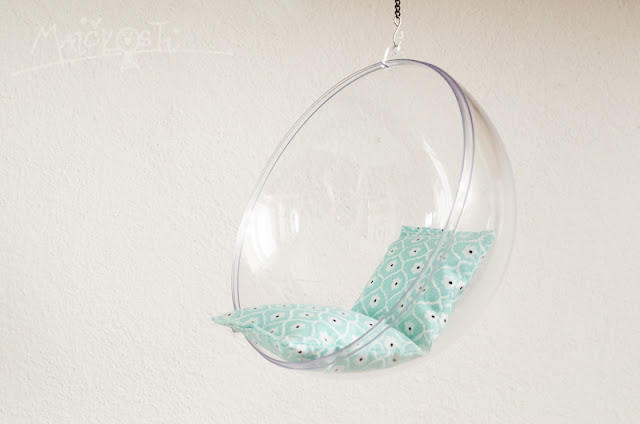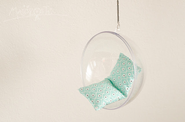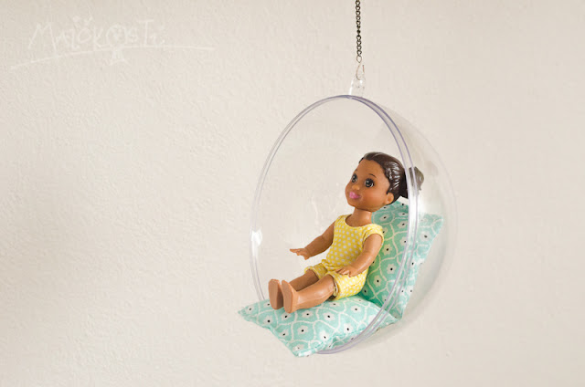 Tohle je - oproti mým jiným projektům - opravdu rychlovka! Dekorační kouli rozdělíte na dvě poloviny. Potřebovat budete jen jednu, ale očko je na obou částech, což je super, takže kdyby vám náhodou dítko s hračkou fláklo o zem a rozbila se, máte ještě jeden pokus ;-) (u nás je zatím stále ve hře verze číslo jedna, Madla naštěstí není demolition man). Řetízek ucvaknete v požadované délce a na každou stranu připevníte drátek tvaru S (pokud máte šperkařské kleště, je to hotovo v cuku letu). No a pak už jen ušít sedák. Já jsem zvolila mentolovou látku, která se bude opakovat v domečku víckrát, aby mi to hezky ladilo. Rozměr hotového výrobku je 5,5x12cm, takže si připočtěte na každou stranu alespoň půl centimetru na zahnutí. Okraje nemusíte nijak opracovávat, vše bude skryto uvnitř, prostě jen obšít obdélník po třech stranách (nebo po dvou, máte-li látku přehnutou), otočit na líc, vycpat lehce dutým vláknem (nepřehánět) a sešít čtvrtou stranu. Zvenku jsem pak znovu přešila i druhý okraj, aby vypadaly stejně, a uprostřed prošila místo, kde se matrace bude ohýbat. Do domečku je třeba zavrtat ze stropu očko, na které se bude křesílko zavěšovat. No a to je vše. Easy peasy a výsledek je efektní. A za pár korun. Takové tvoření mám nejraději! Vyzkoušíte? ;-)