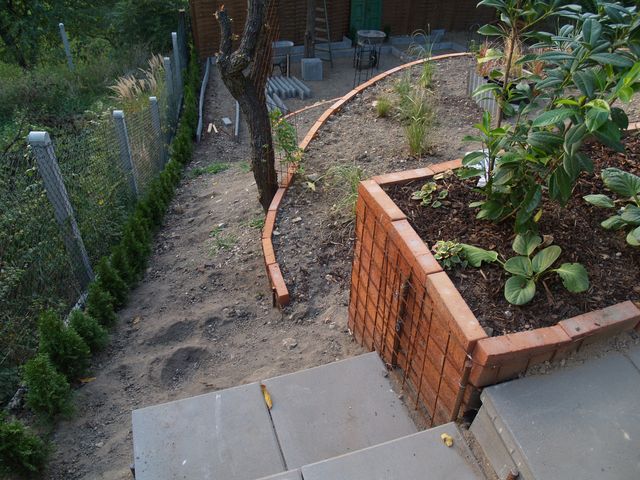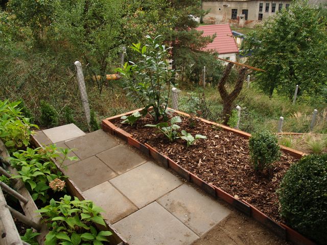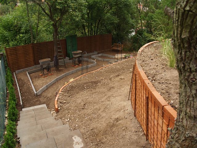 Ve spodní části jsou nachystané obrubníky, které v další etapě půjdou do země, cesty se zasypají štěrkem.