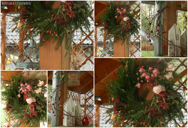 A protože jsem netroškařila, materiálu bylo dost na věnce dva – ten druhý už visí na jednom dřevěném sloupu u terasy a několik modřínových větývek s šípky kousek od něj 🙂
