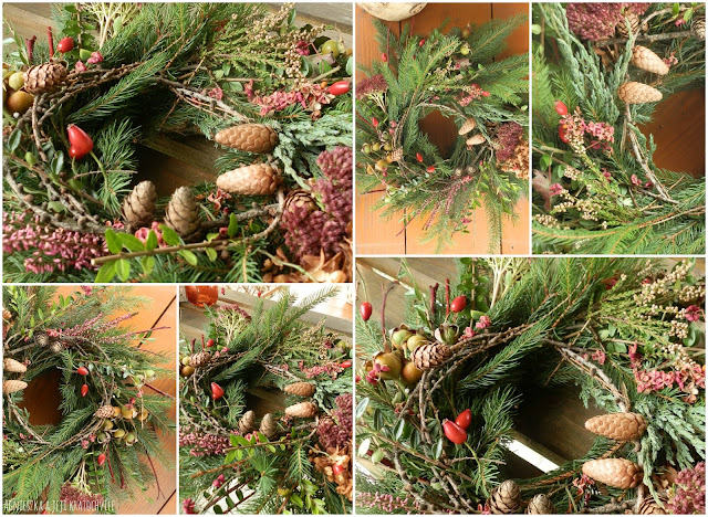 Na stráních jsem pak doplnila přírodniny o větvičky s šípky, plody brslenu, vínově červené větvičky svídy bílé… zahrada jednoho ze sousedů s přerostlým živým plotem ze smrků poskytla smrkové větvičky a vlastní zahrada pak květenství rozchodníkovců, růžiček, větvičky zimolezu kloboukatého, snítky vřesu, ale také buclaté šípky pnoucí růže, které jsem zapomněla odstřihnout hned po odkvětu…