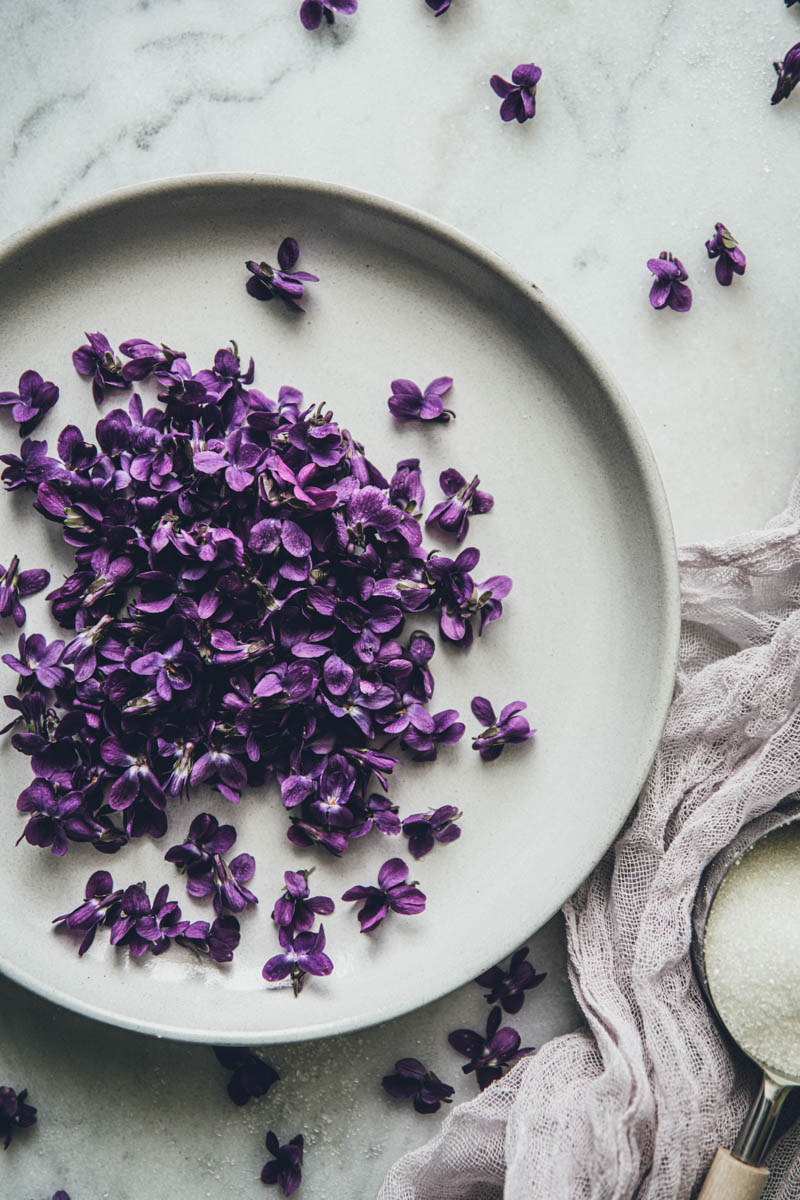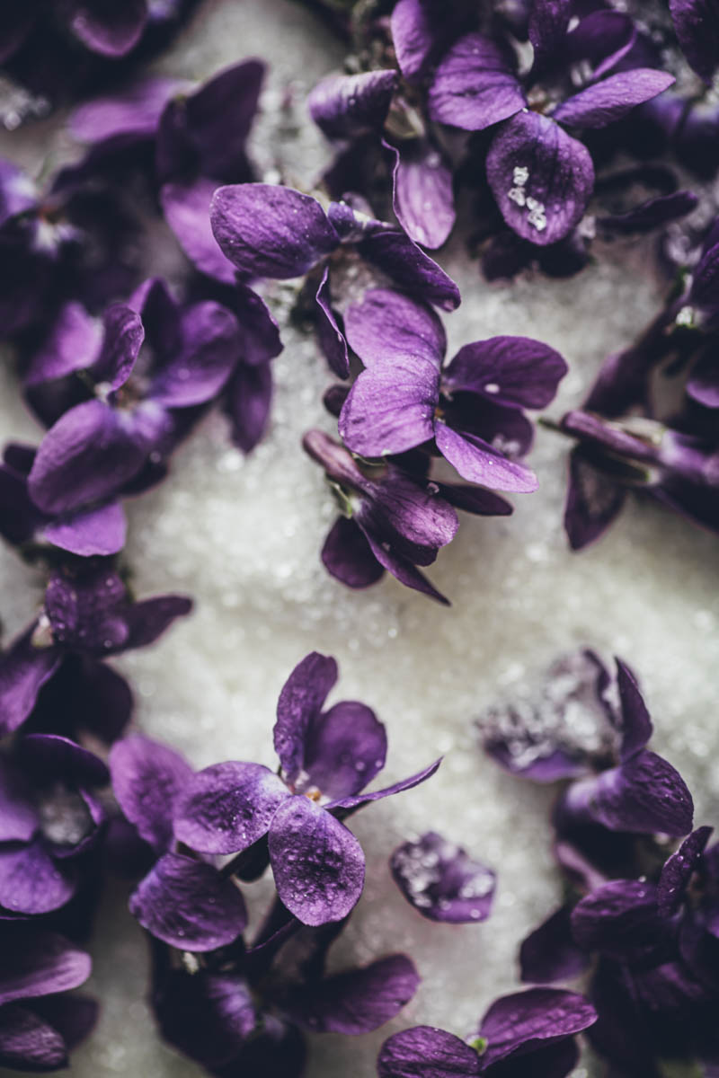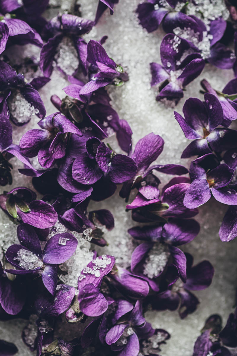 V mixeru nebo food procesoru smíchejte fialky a cukr a mixujte tak dlouho, dokud se cukr neobarví a kvítky se nerozemelou.