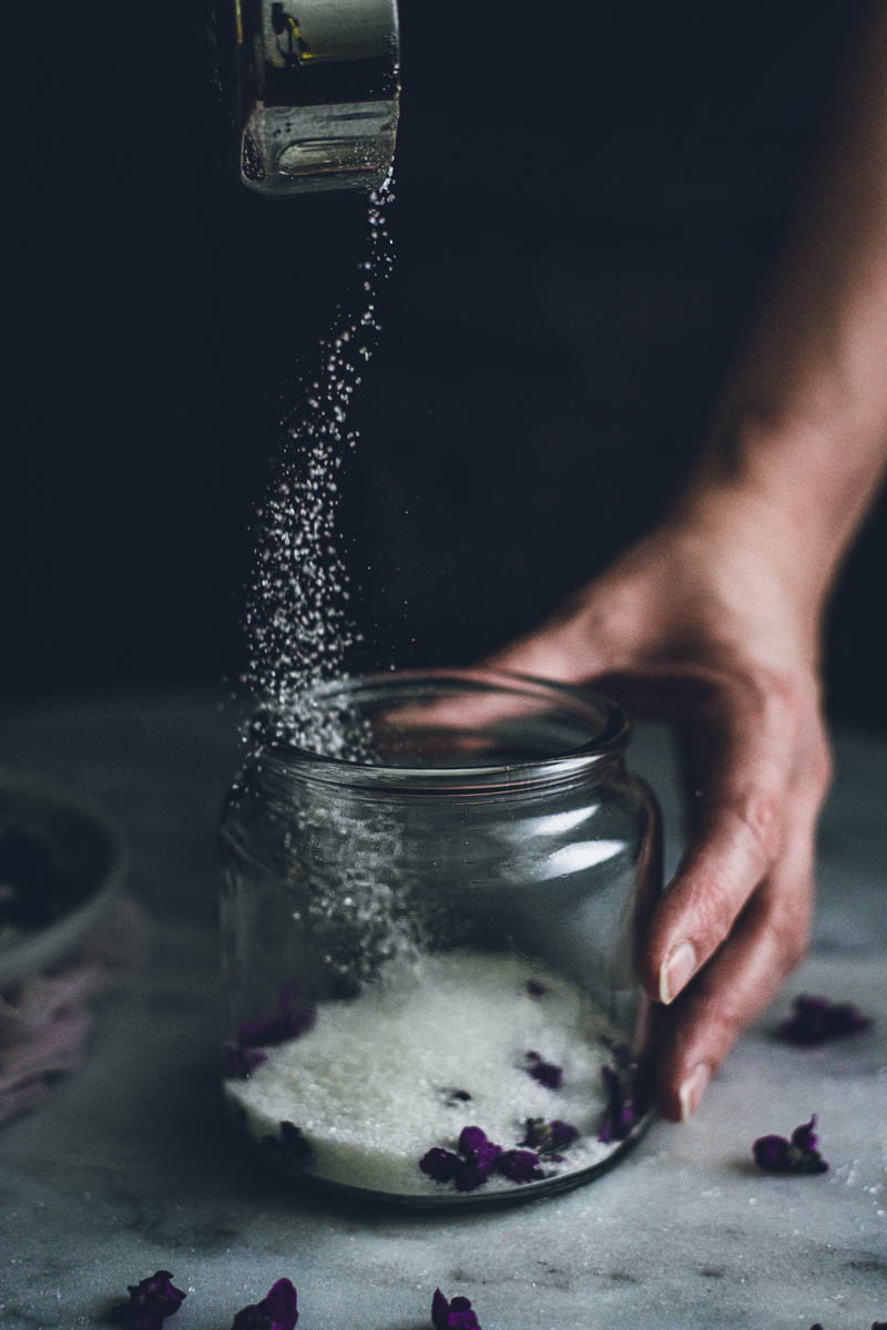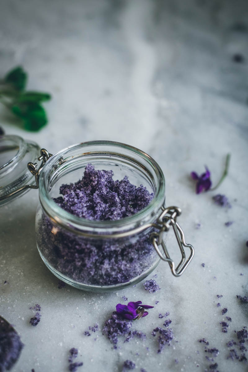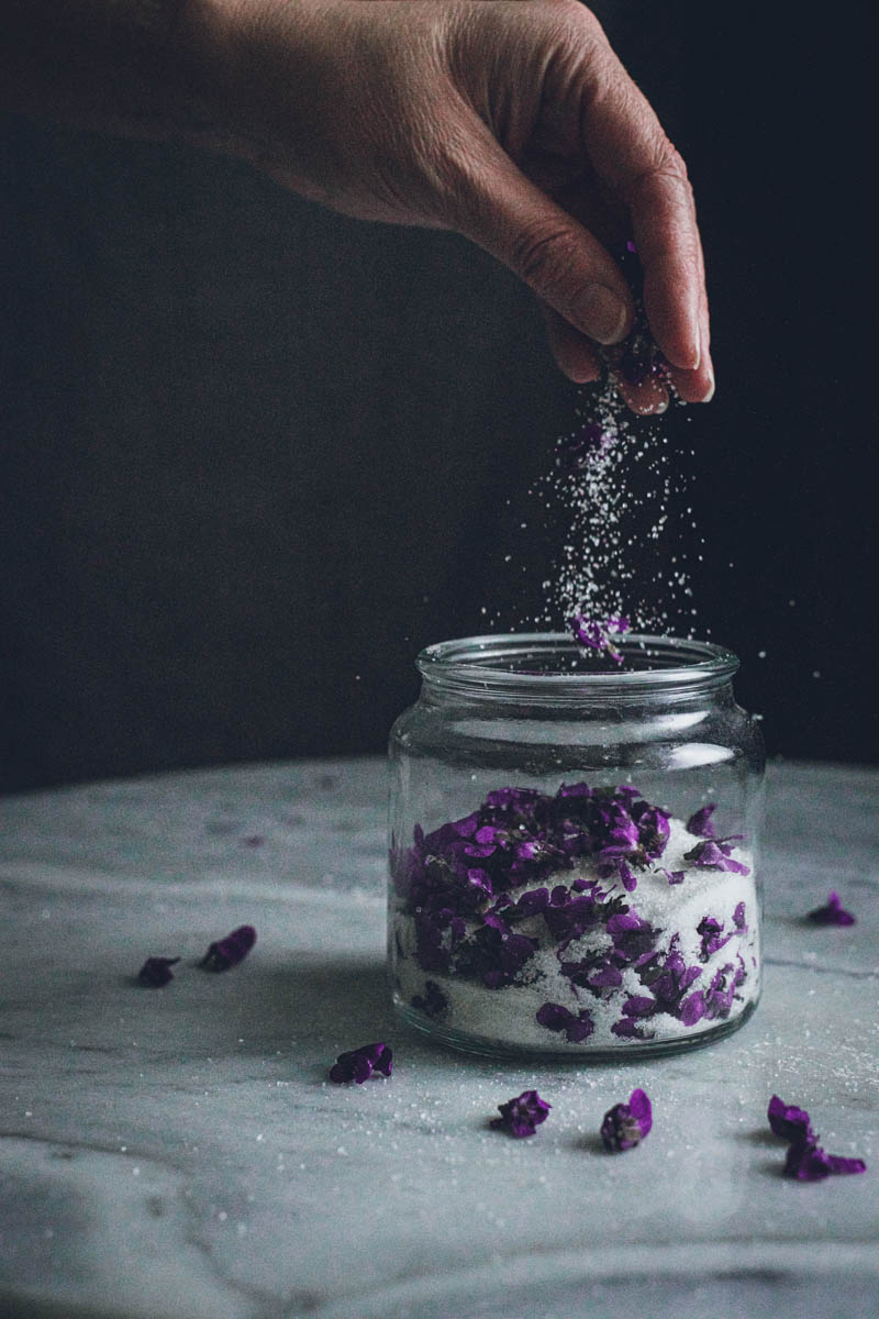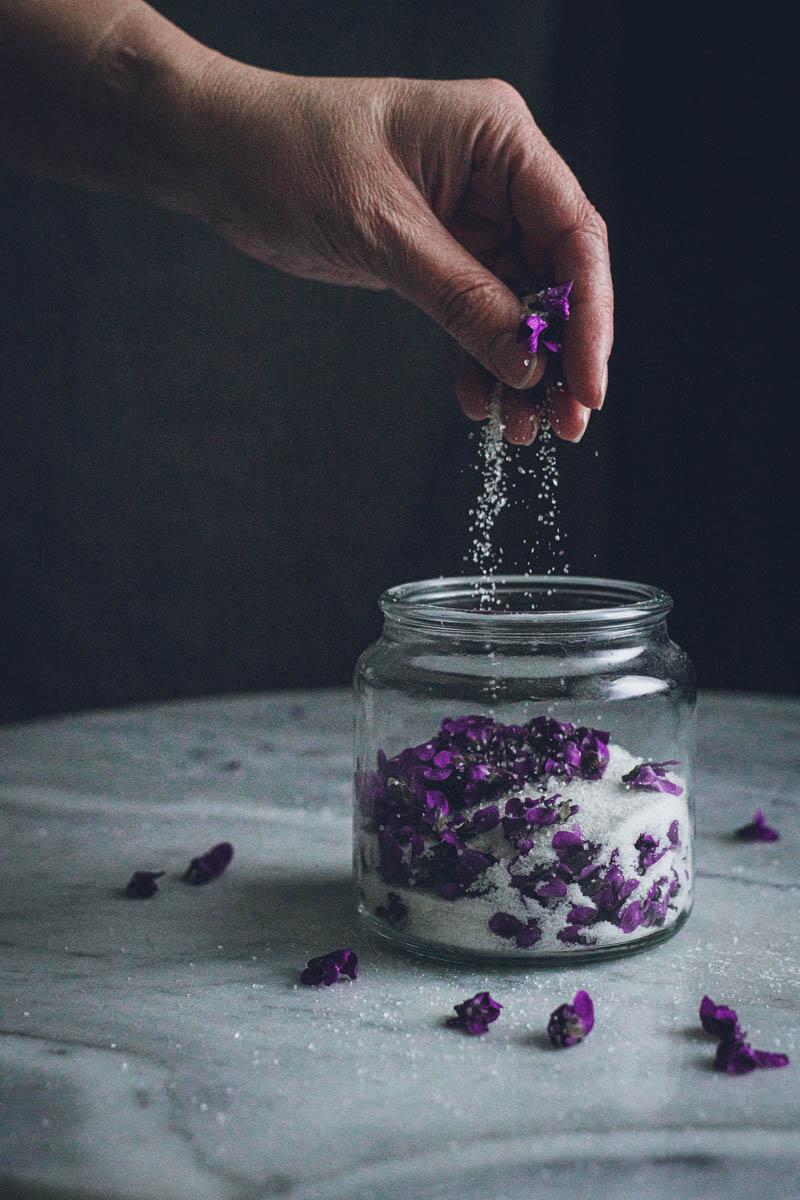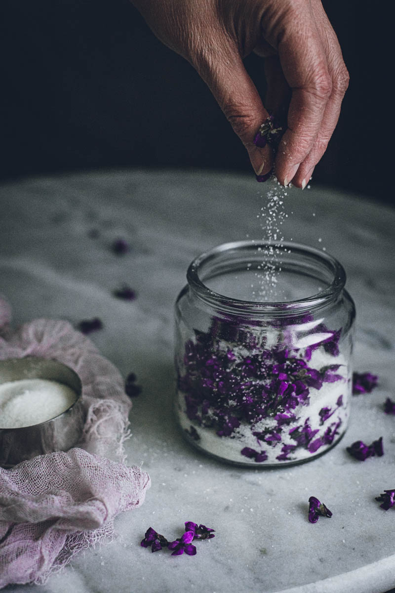 Musím se přiznat, že když jsem poprvé čichla k čerstvě rozmixované směsi, fialky jsem necítila. A výsledná směs byla vlhká a vznikla jedlá hrouda. Proto jsem jej ještě vyzkoušela usušit v horké troubě. To velmi pomohlo, vůně se zvýraznila a cukr byl krásně usušený a křehký.