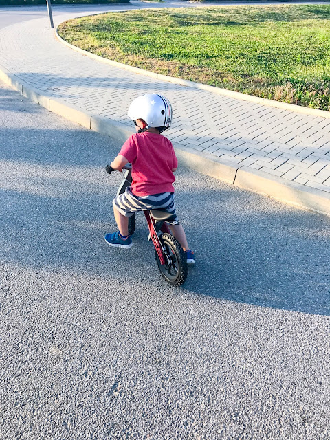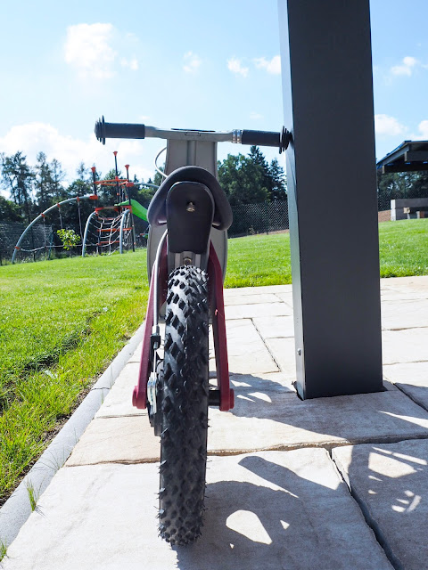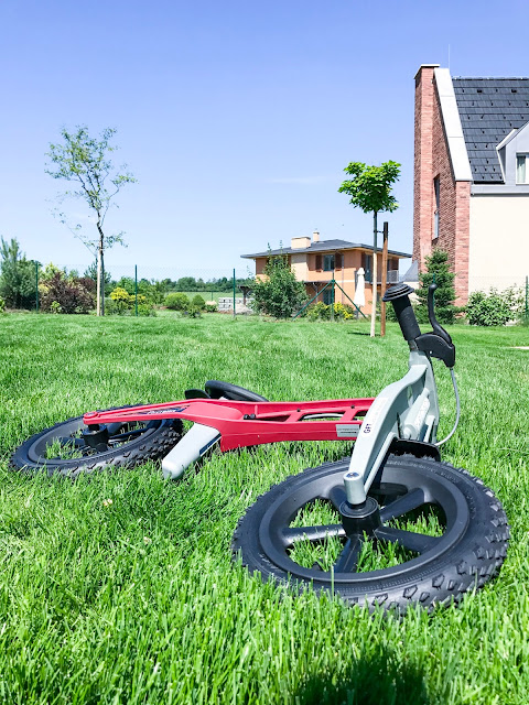 Když kolo přišlo a složila jsem ho - jáááá sama, tak bylo velké nadšení, ale stejně se pořád vracel k tomu rozviklanému, řvoucímu, starému odrážedlu, říkála jsem si proč a asi to bylo tím, že na tomto novém kole se musel chlapec víc snažit, už je to jako to VELKÉ kolo akorát bez šlapek, takže rovnováha je nutná a já si uvědomila že naše hyperaktivní dítě je snad líné nebo co. Každopádně dala jsem tomu pár dní a jen chytl ten správný balanc, tak už z toho nechtěl dolů. ~ jako občas to vypadalo dost zajímavě, fakt nechápu, že z toho ještě nespadl, ty první manévry vypadající jak když má 3 promile a celá ulice mu byla malá :D ~ Co vám budu povídat, gumová kolečka, to je slast pro uši, takže spokojená celá rodina, vřele doporučuju. Kolo je skvěle udělané i jako příprava pak na kolo velké. Musí se tu držet balanc, kolo má i brzdu na řidítkách, tu teda Maxík používá zásadně do kopce a pak u toho řve, no není divu. On se to ale všechno naučí, on prostě rád brzdí těma novýma teniskama, vizáž ošoupaných špiček u třech bot se mu evidentně zamlouvá. A sedlo je polohovací, proto je kolo určeno pro děti od 2-5 let, sedlo se zvedne, nebo sníží a jede se dál. Musim říct, že kolo má úspěch nejen u něj, ale i v celém okolí, vypadá na tom jak nějaký profi jezdec bmx. ~ prostě už velkej kluk no, nebo superhero, obojí je důležitý :) ~