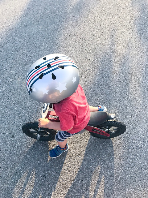Pořídila jsem mu k tomu i stylovou helmu Nutcase s hvězdičkama a červeným pruhem, aby ladil samozřejmě, dost mě zaujal nápis vzadu: "I love my brain" to sedí. Velký problém nasadit mu helmu na hlavu, ale teď se řekne kolo jen s helmou, tak běží a narve si jí na hlavu sám, klidně i obráceně, hlavně aby už jezdil. :) Miluje ho.