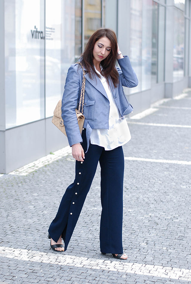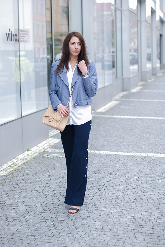 A k outfitu…trend širokých kalhot mě jako každý jiný nechával dlouhou dobu chladnou. Já si na to prostě musím přijít postupně sama, a tak se dostalo i na něj. Tyhle s perličkami na bocích jsou zajímavější a navíc ty rozparky vypadají suprově s podpatky. Dlouhá košile a látkový biker k nim perfektně jdou. Jestli se vám tenhle outfit líbí a chtěli byste jej nosit i těď, tak pár tipů, jak ho přetransformovat. Místo sandálků nazujte ponožkové kozačky, které krásně zvýrazní kotníky a dají kontrast se širokými nohavicemi. Pod košili nebo místo ní se dá obléct rolák a namísto látkového, oblečte kožený křivák nebo rovnou kabát. Důležitá je tady pořád výška, abyste kalhoty netahaly po zemi. Jedině tak vás krásně prodlouží a to umí parádně 🙂 Co říkáte na tenhle outfit..?