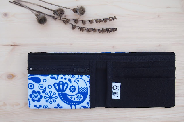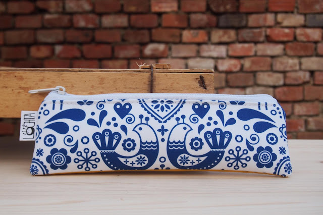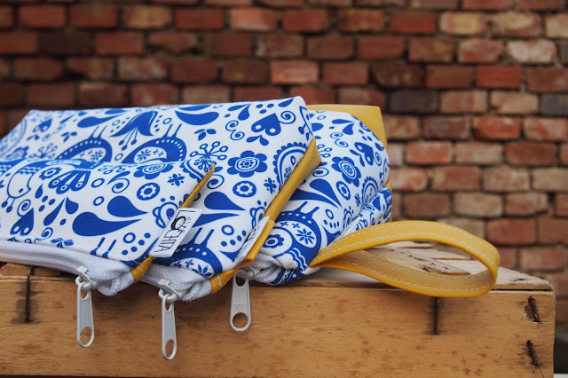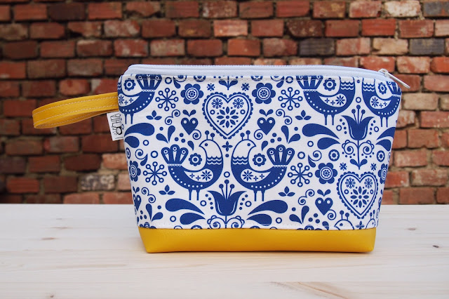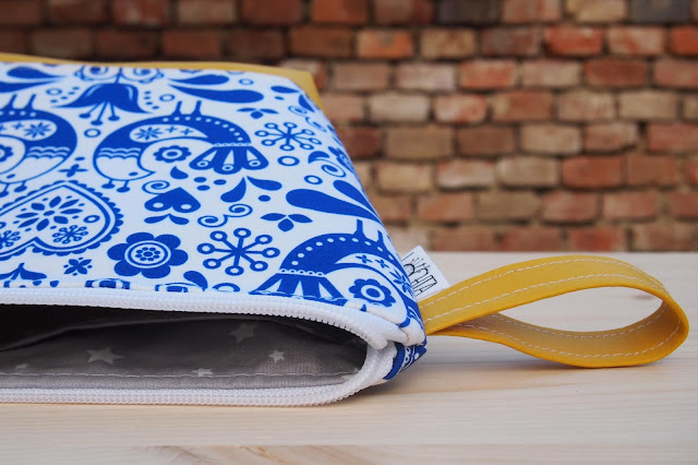 Moc se mi líbí modrobílé kombinace, navíc ten lidový motiv! Dlouho jsem koumala, co k němu za barvu koženky. Nakonec mi tmavě modrá přišla až moc tradiční, červená příliš ostrá a světlá? Světlá. Takže žlutá, která tradiční lidovou notu pěkně zasadí do moderní doby.