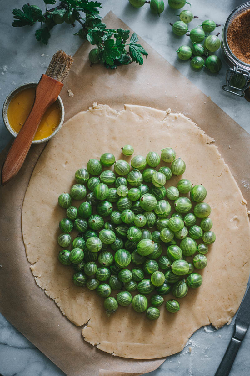 Rozhodla jsem se, že tentokrát upeču galetku. Používám na ni stále stejný osvědčený recept, který mě nikdy nezklamal. S těstem se moc dobře pracuje, obměňuju i mouku, cukr, přidávám koření. Angrešt jsem nijak zvlášť neupravovala, chtěla jsem zachovat jeho jemně nakyslou chuť, proto jsem nepřidávala ani další cukr.