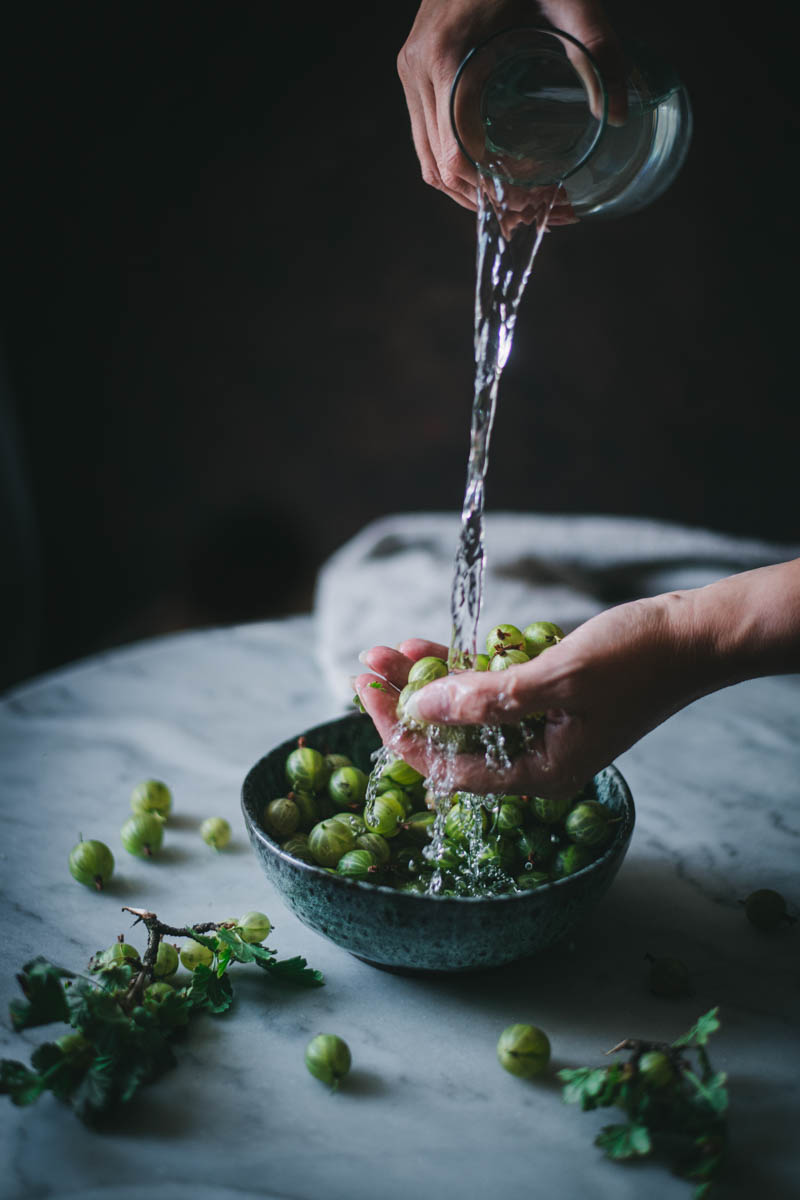 Mezitím omyjeme angrešt a odstraníme z něj stopky a chlupatý konec (vůbec nemám tušení, jak se mu říká :-)).
