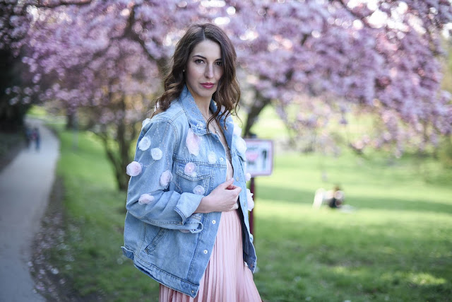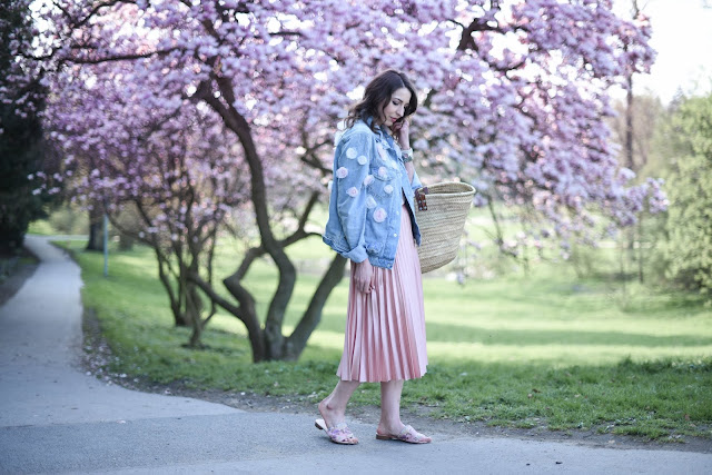 DIY + Zara denim jacket, Zara pleated skirt, HM lace top, Nila french basket, Forever 21 sandals