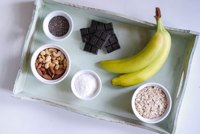 Jako první rozmixujete zralé banány na kaši, tu promícháte s vločkami, aby se celé obalily. Mezitím si nožem nasekáte ořechy a čokoládu a společně se všemi dalšími přísadami přidáte do mísy k vlhkým vločkám. Pořádně promíchejte, aby se vše spojilo. Směs musí být vlhká. Pokud není, přidejte ještě další namixovaný banán. Nechte půl hoďky odstát, aby vločky změkly.