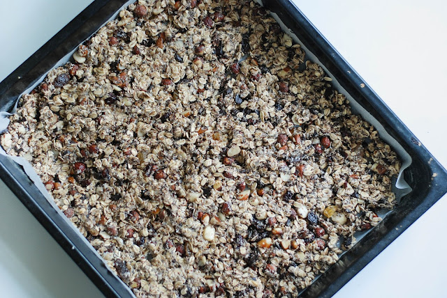 Vyložte si plech pečícícm papírem, směs na něj vyklopte a upěchujte po celé ploše. Dejte péct na střední rošt na 150 stupňů dozlatova.