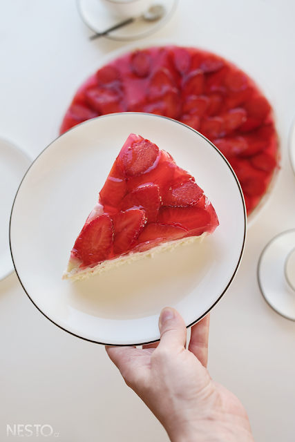 Na závěr si na krém poklademe omyté a nakrájené jahody, já pak ještě přelévám želé (ne to tuhé), protože mi to ty jahody zakonzervuje a neoschnou.