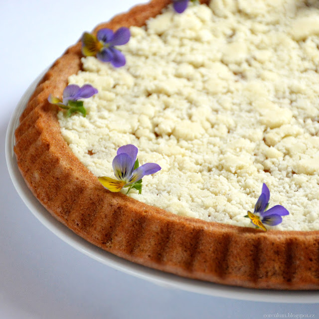 Vejce si vyšleháme s vanilkovým extraktem, špetkou soli a rozpuštěným máslem do krémové pěny (šleháme cca 5 až 10 minut). Následně přiléváme jahodovou dřeň (o pokojové teplotě!) a polovinu tabulky bílé čokolády, kterou jsme si rozpustili ve vodní lázni nebo v mikrovlnné troubě (<< do skleněné misky nalámeme 50 g bílé čokolády, podlijeme lžící vody a dáme na 25 sekund do mikrovlnné trouby na 700-750 W, následně rychle promícháme). Poté do krémového těsta po lžicích přidáváme hladkou mouku s kypřicím práškem. Na závěr vmícháme na malé kostičky nakrájenou bílou čokoládu. Těsto nalijeme do vymazané koláčové formy a dáme péct na 180 °C po 30 minut. Na marcipánovou posypku si do misky dáme sušené mléko, moučkový cukr a zakápneme javorovým syrupem/medem, přírodním aroma, olejem a vodou. Promícháním a třením o střeny dlouhou lžicí utvoříme drobenku, kterou posypeme hotový korpus koláče. Pokud se vám hmota zdá být stále příliš sypká, přidejte několik kapek vody. Plochou částí lžíce udusáme krustu a zdobíme například jedlými květy. **Doporučuji poklást na okrajích plátky čerstvých jahod. Recept jsem připravovala bohužel ještě před dozráním vlastních ze zahrádky a proto se musel obejít bez. :)