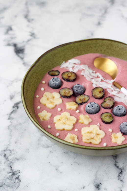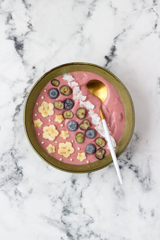 Všechny suroviny dáme do mixéru a podle jeho výkonnosti buď ovoce necháme chvíli povolit, nebo rovnou rozmixujeme na hladký krém. Přelijeme ho do misky a podle chuti ozdobíme. (Já jsem použila banán, pufovanou quinou, mražené borůvky a kokosové plátky).