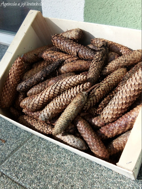 Chtěla jsem výlet do lesa využít k tomu, že si nasbírám i nějaké šišky na dušičkové věnce a případně do podzimních dekorací kolem domu a nepřišli jsme s prázdnou, taška byla plná během chvilky. Protože ale bylo po dešti, šišky se pěkně pronesly… Teď už se pěkně suší a čekají na další zpracování .-)