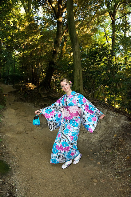 Zpátky ale od legendy do Kjóta. U historických památek, tedy i u Fushimi Inari, byla velká koncentrace skupinek děvčat oděných do tradičního japonského oděvu kimono. Trošku jsme pátrali a zjistili jsme, že se v okolí nachází velké množství půjčoven, které vám za poplatek na celý den kimono půjčí a umožní vám v něm chodit po historickém centru Kjóta. Některé půjčovny vypadaly spíše jako salony pro gejši, kde vás i učesali a nalíčili. Já jsem si nechala vyrobit rychlý účes, který trval snad jen deset minut, protože jsme si kimono půjčili zhruba dvě hodiny před zavíračkou. Pokud bychom strávili v okolí celý den, určitě bychom si kimono nechali déle, ale jak jsme byli celý den pokaždé někde jinde, určitě by nebylo moc pohodlné v něm chodit po celém městě, nosit batoh, nastupovat do auta a tak podobně. Ale i ty dvě hodinky jsme si náramně užili, člověk si najednou připadá nějak víc slavnostně:-) Miro si nakonec také půjčil kimono, ale jednak na něj všechny byly moc krátké a jednak ty mužské verze vypadají spíše jako mnišské hábity. Celá procedura oblékání ženského kimona je záležitost na 10-15 minut, kdy vás obléká speciálně vyškolená asistentka a váže na vás další a další vrstvy stahovacích mašlí, takže pak ve výsledku nemůžete vůbec dýchat. Správně si zavázat kimono sama je snad nemožné. Nesmí chybět ani speciální palcové ponožky se zářezem mezi palcem a ukazováčkem (Tabi) a také typickou obuv připomínající kombinaci dřeváků, sandálů a žabek. Bot je více druhů, např. ty, které jsou celé ze dřeva, se nazývají Geta. V botách se kupodivu chodilo velmi dobře. Akorát při chození do kopce a z kopce v položkách trochu klouzaly, ale o dost méně než by člověk očekával. Kimono jsme si chtěli koupit domů jako suvenýr, ale narazili jsme na samé půjčovny, které kimona neprodávaly a pokud ano, ve velmi omezeném výběru. Nakonec jsem si koupila tmavě modrou yukatu s růžovým zdobením a barevnou mašlí. Rozdíl mezi kimonem a yukatou je ten, že kimono je více slavnostnější a formálnější a je vyrobeno z hedvábí, kdežto yukata je vyrobena z bavlny, je určena spíše pro nošení v létě a také je méně formální. Určitě si ale nezvládnu yukatu zavázat správně, spíš to budu mít takový XXL župan:-)