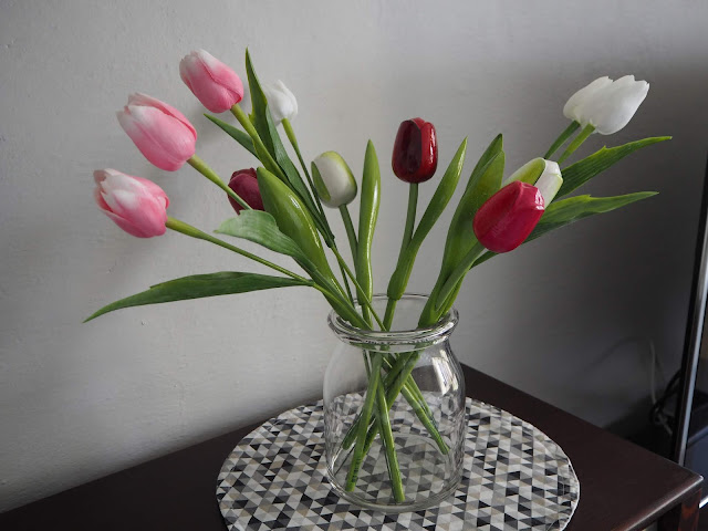 ... koupit živé tulipány jsem ještě nestihla, tak jsem vytáhla aspoň ty, které mám doma celoročně ...