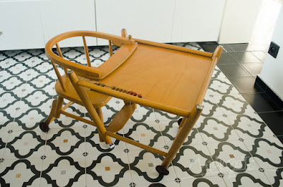 Jídelní židlička ze sedmdesátek, její design je ovšem věčný. Rozpracovanou ji mám už několik měsíců, ale jelikož je v provozu, nemůžu ji nechat někde ležet pod nánosy prachu z broušení, a tak je to dost drbačka, pořád s ní chodit tam a sem a je otázka, zda z ní dřív Madla nevyroste, než ji dokončím 😀