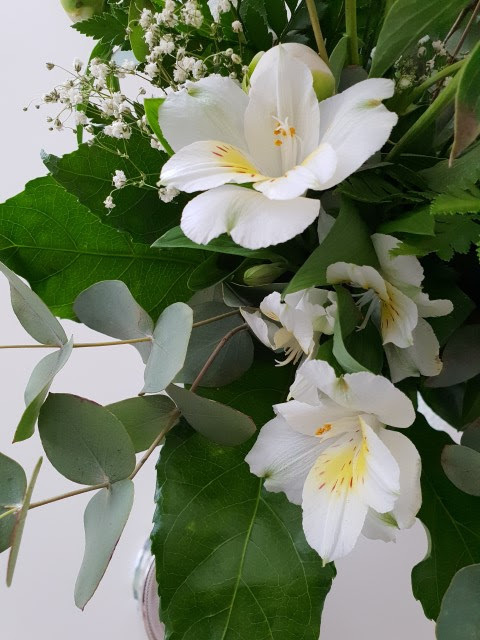 Od víkendu som mala doma veľa kytíc. Niektoré kvety vo viazaných kyticiach povädli a iné boli ešte v stave ďalšieho použitia. Bolo by škoda ich zahodiť. Tak som dnes všetky kytice rozviazala a z kvetov čo zostali, vznikla táto krásna kytička doplnená pukmi bielych pivoniek z našej záhrady.