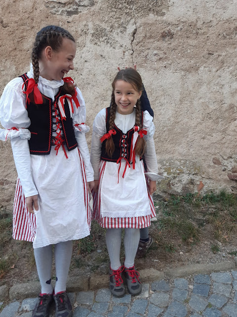 Začala mší věnovanou misiím, kde naše holky v Tišnovském kroji zastupovaly Evropské děti a pokračovala mým předobědovým focením ušitých věcí pod Květnicí. Po obědě jsme vyrazili kolem vodopádků ze Štěpánovic nahoru do kopce na nádherně vybarvené louky s dalekými výhledy. Balíky, které zaručeně nahradí všechny hřiště světa, draci, na které byl malý vítr, trocha stresu a mrčení, protože bez toho by to nešlo a domácí perník zabalený v krabičce. A taky spoustu fotek od Klárky a pár i od Terezky, protože holky to začíná bavit.