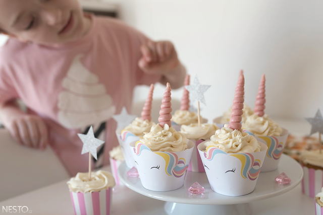 I letos jsem sáhla po receptu na Vanilkové cupcakes. S krémem se krásně pracuje. Šablony na košíčky jsem koupila na Etsy a následně vytiskla. No a jednorožčí roh vznikl jednoduše - marcipán jsem omotala kolem špejle, kterou jsem následně zapíchla do krémem nazdobených cupcakes. A to mělo úspěch také. Navíc to tvoření slečnu bavilo. Samozřejmě to nebylo jediné pohoštění, ale právě na cupcakes jsem na Instagramu dostala hodně dotazů.