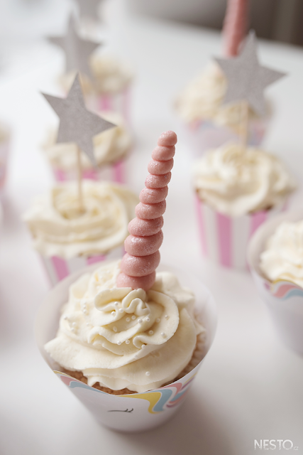 I letos jsem sáhla po receptu na Vanilkové cupcakes. S krémem se krásně pracuje. Šablony na košíčky jsem koupila na Etsy a následně vytiskla. No a jednorožčí roh vznikl jednoduše - marcipán jsem omotala kolem špejle, kterou jsem následně zapíchla do krémem nazdobených cupcakes. A to mělo úspěch také. Navíc to tvoření slečnu bavilo. Samozřejmě to nebylo jediné pohoštění, ale právě na cupcakes jsem na Instagramu dostala hodně dotazů.