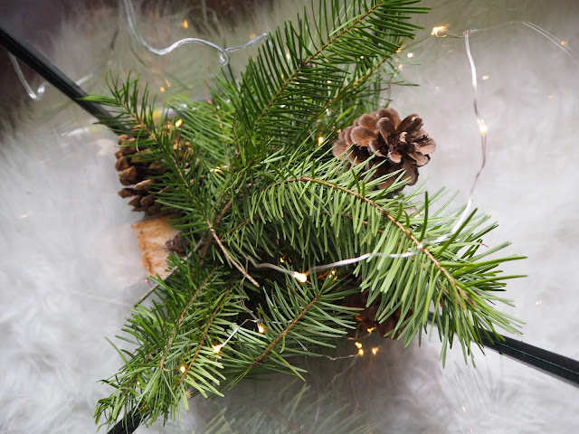 … odpadlé větvičky jsem naházela se šiškami a světýlky do závěsného svícnu, který momentálně není zavěšen, ale postaven na skříňce 😉 …